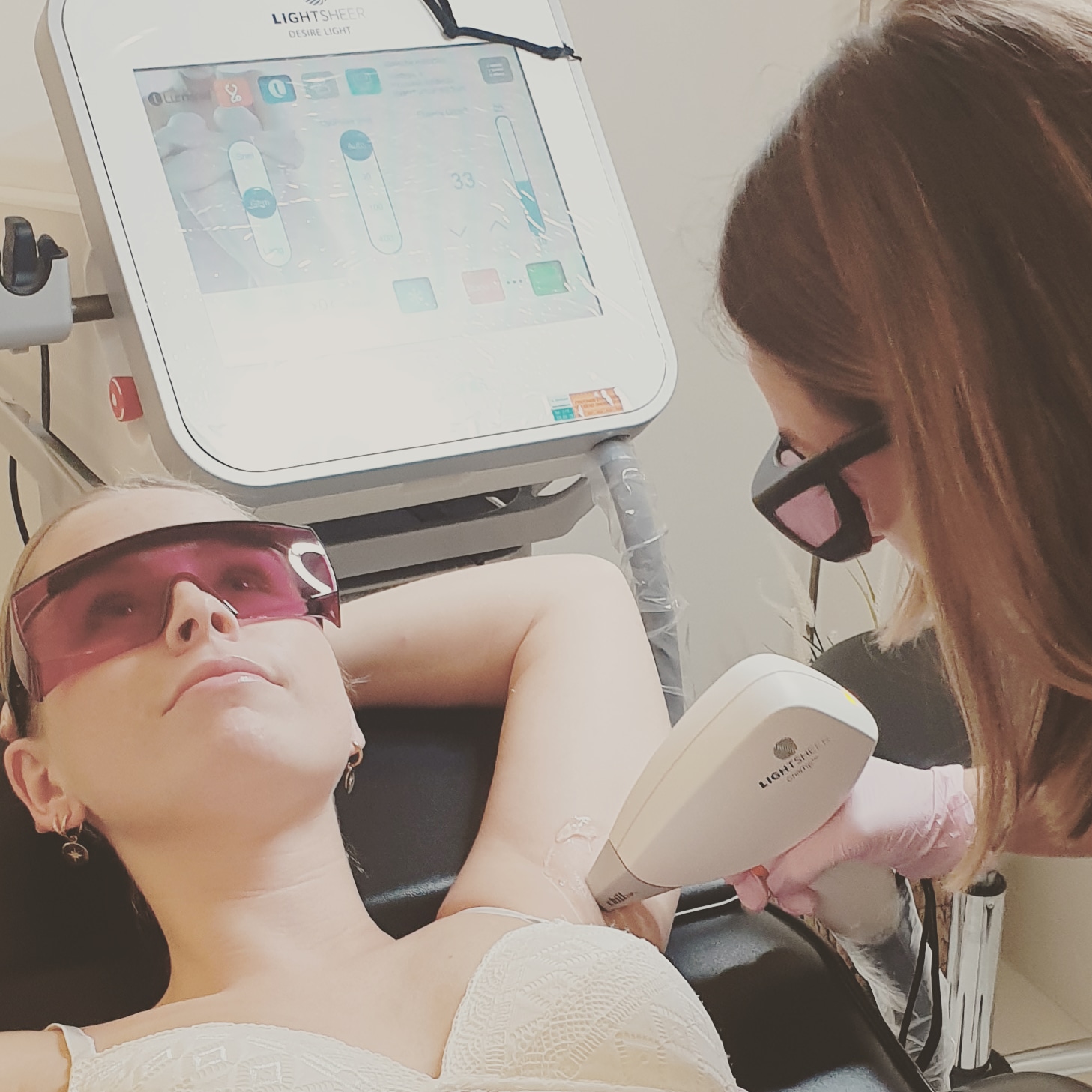 Op de huid zal voor aanvang een dikke laag verkoelende gel aangebracht worden, deze gel dient als geleider voor de lichtpulsen. Hierna gaan we aan de slag met het apparaat voor de laserontharing. Het apparaat beschikt over een kopstuk dat een speciale koelfunctie bevat, deze koelfunctie zorgt ervoor dat wanneer de laser in contact komt met de huid en hij een warmtepuls geeft, de omliggende huid en onderliggende bloedvaatjes beschermd zijn tegen de hitte van de laser.